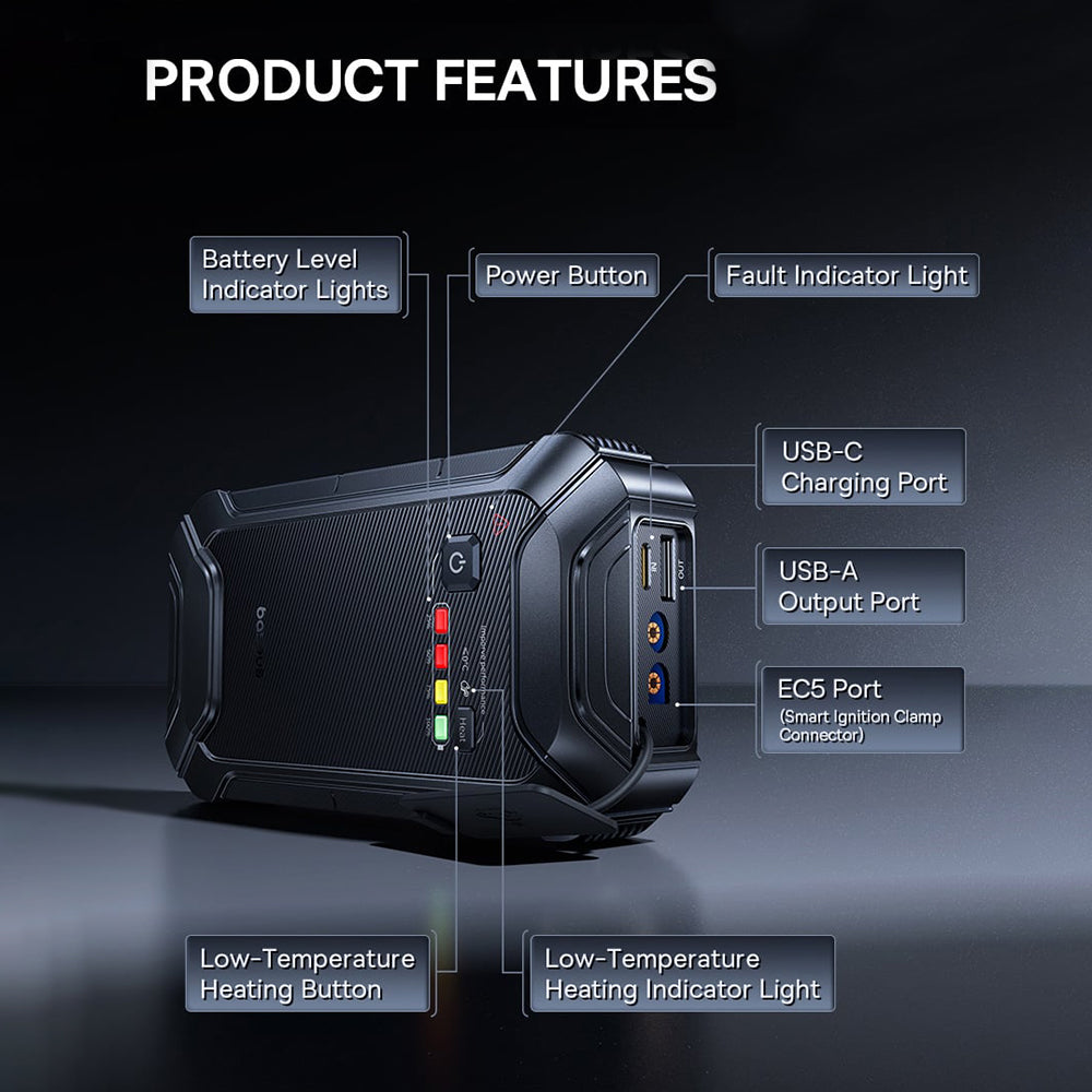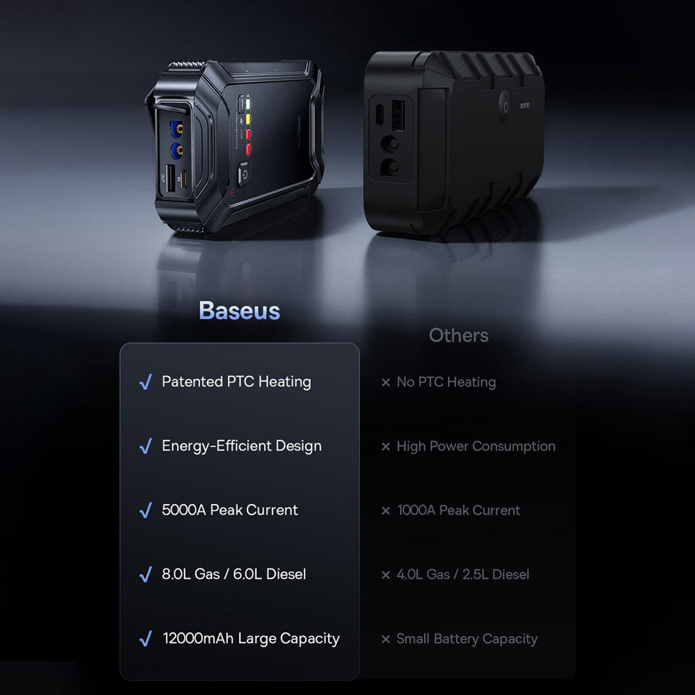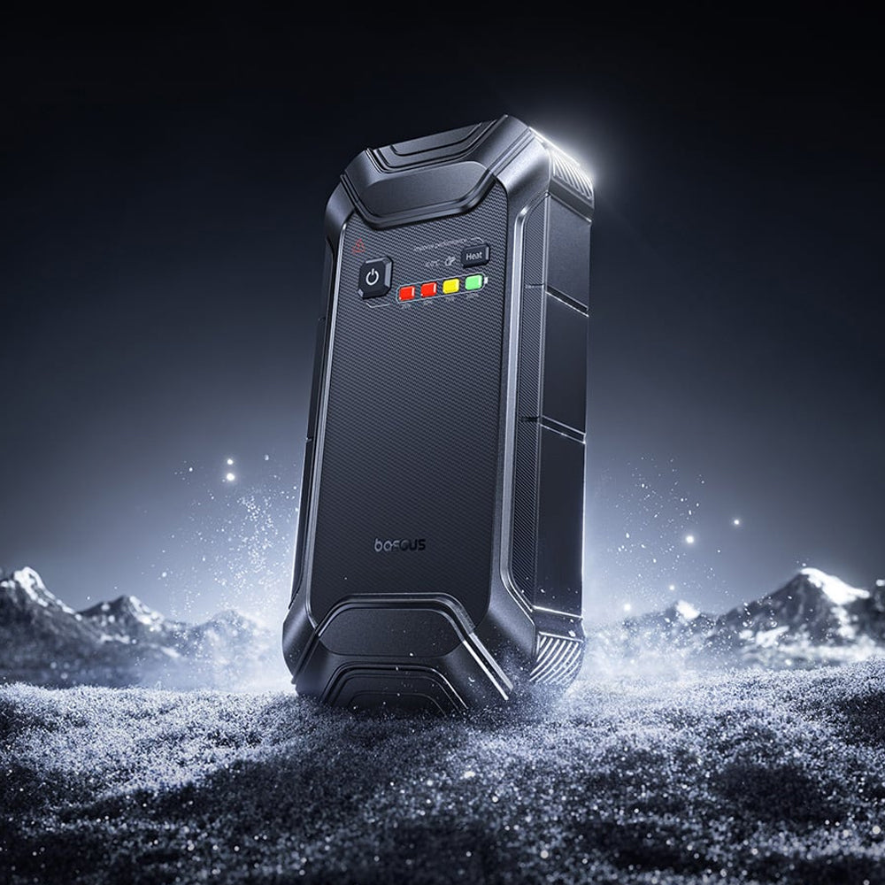 • Baseus has the perfect solution for you! This portable jump starter allows you to quickly restart your car in any emergency situation. Additionally, the device includes an LED flashlight. Every driver should have one!