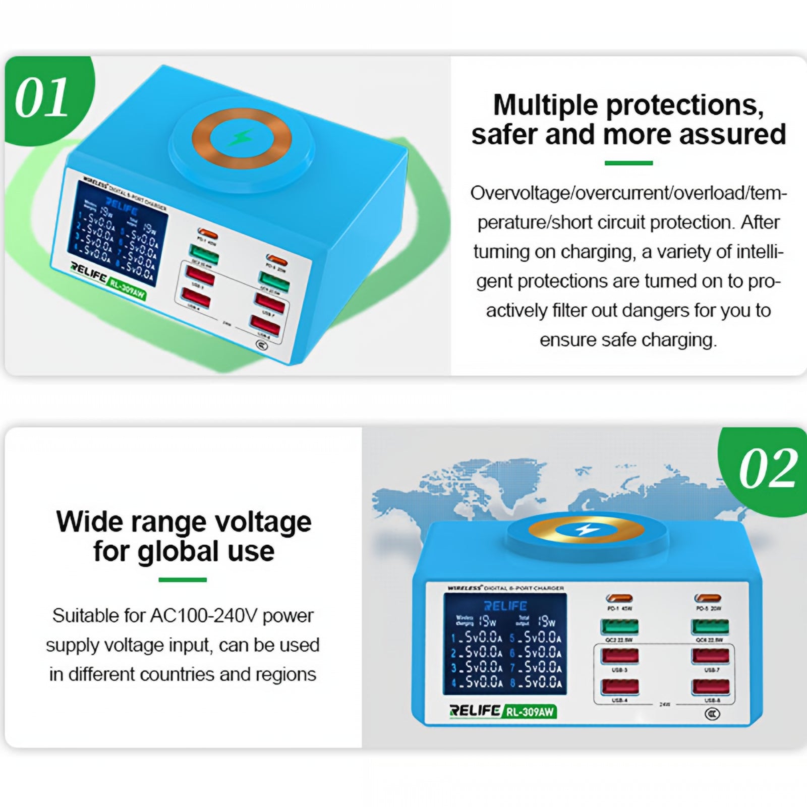 Relife RL-309AW Charging Station - Blue The Relife RL-309AW charging station is designed for you if you use multiple devices and want fast, safe, and organized charging at home or in the office. You can simultaneously charge phones, tablets, and laptops from popular brands such as Apple, Samsung, Huawei, Xiaomi, and many others. The 15W magnetic wireless charging ensures precise positioning and strong attachment, preventing the phone from slipping during charging. The high-power PD port reaches up to 45W, making it ideal for laptops such as the 16-inch MacBook Pro. The HD LCD display, positioned at a 45-degree angle, provides you with clear and easy-to-read information, and the smart sleep function automatically turns off the screen after 30 minutes for added comfort. Multiple protection systems ensure stable and risk-free charging. Features: - Maximum total power: 100W - Magnetic wireless charging: 15W - Strong magnetic positioning - PD1 port: up to 45W (supports laptop charging) - Supports fast charging PD 3.0 and QC 3.0 - Maximum fast charging current: up to 3A - HD LCD display tilted at 45 degrees - Smart sleep function: the screen automatically turns off after 30 minutes - Screen activation by vibration or light touch - Multiple protections: overvoltage, overcurrent, overcharge, temperature, short circuit - Compact design, ideal for office or home - Compatible with USB phones, tablets, and laptops